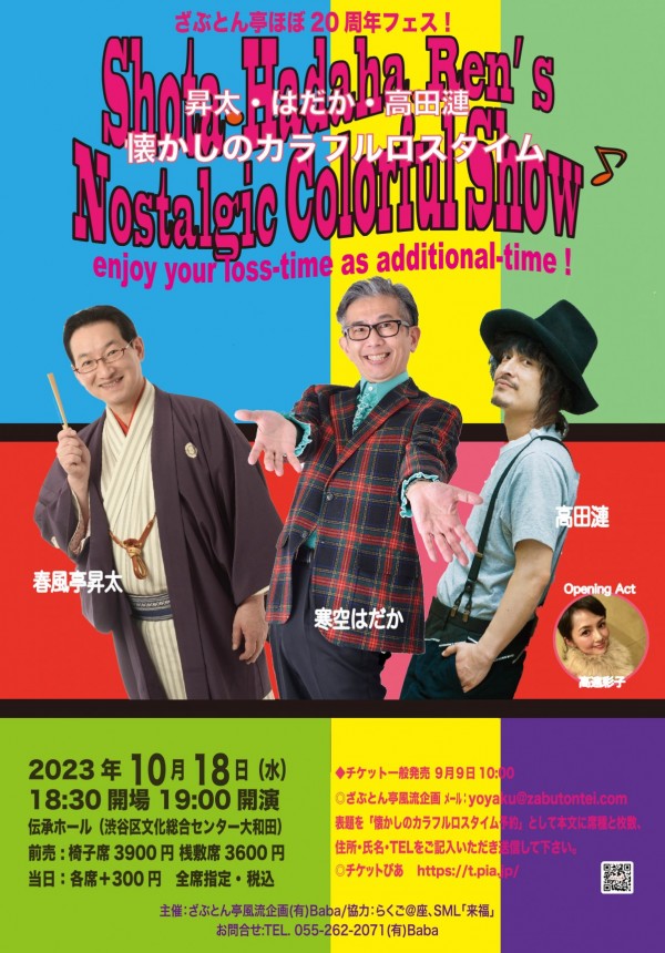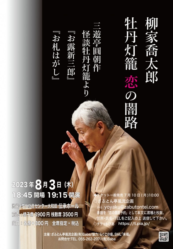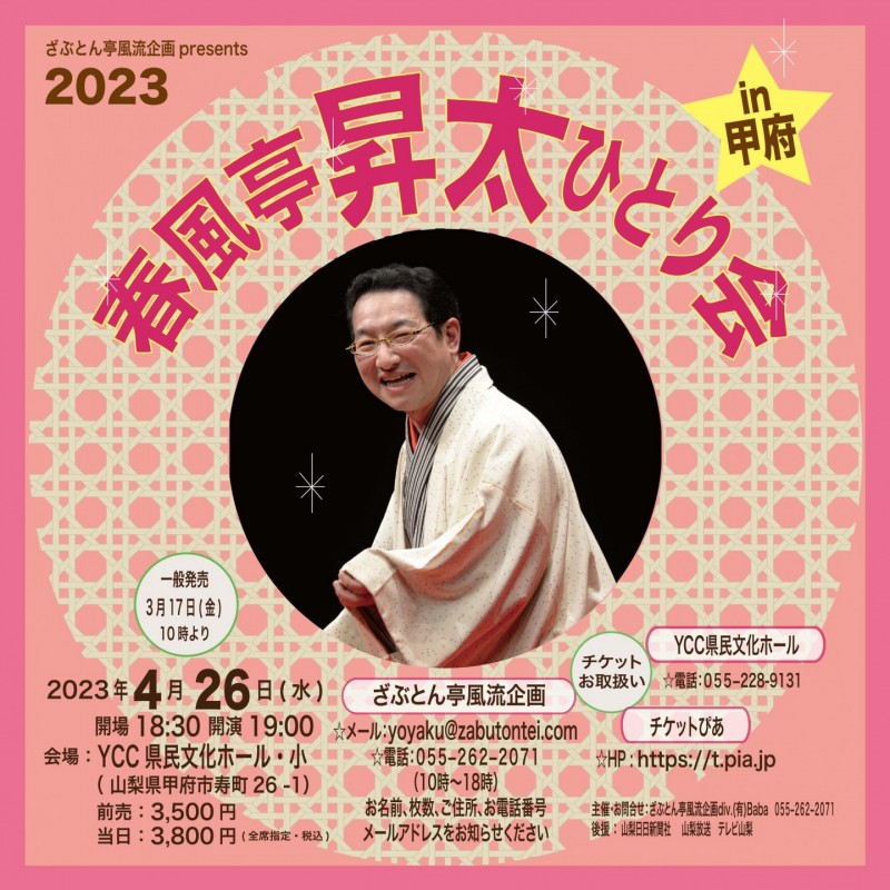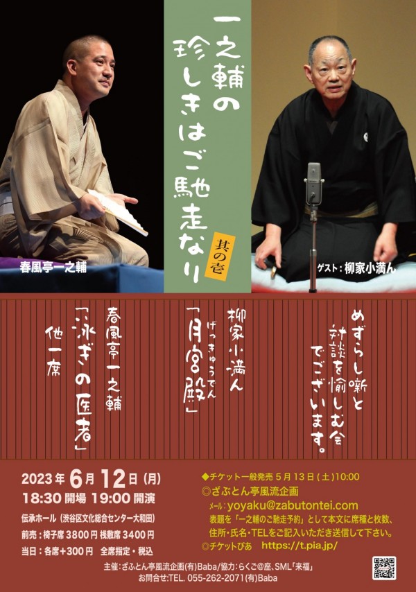 ◇メールyoyaku@zabutontei.com 宛 表題を「先行予約昇太2023」として、チケット枚数、郵便番号、住所、氏名、電話番号、メールアドレスをお知らせください。