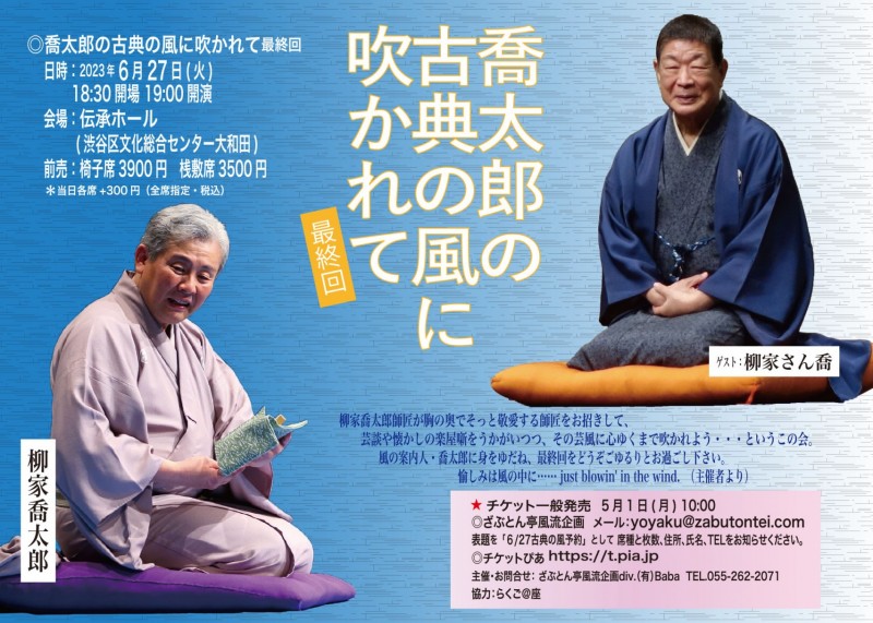 表題を「古典の風最終回予約」として、席種と枚数・住所・氏名・TELをお知らせください。